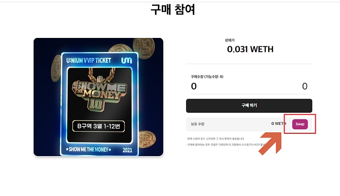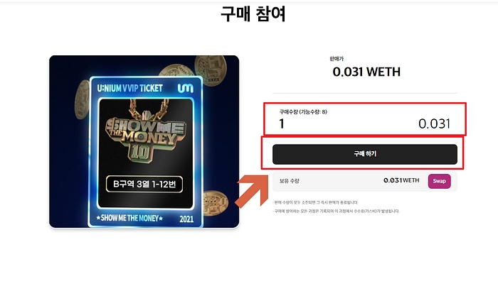 다시 구매 화면으로 오게 되면 보유하고 있는 WETH 수량이 나오게 되는데 구매 수량을 선택한 후 ‘구매하기’ 버튼을 누릅니다.