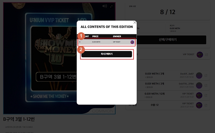 상품구매 및 경매참여 방법은 현재 U:NIUM에서 판매가 완료 SMTM10 콘서트 티켓을 예로 설명드리겠습니다.