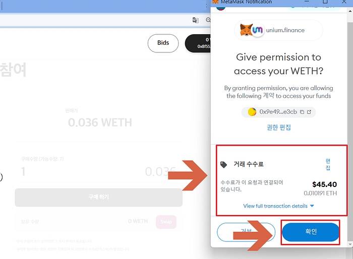 해당 이미지는 해당 계약의 접근 권한을 주겠냐는 내용의 메시지인데 거래수수료를 확인하고 확인을 누르면 구매 진행이 됩니다.